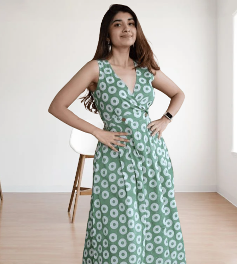 Handcrafted green cotton A-line dress with batik handblock prints, V-neck, and sleeveless style — a perfect fusion of ethnic artistry and modern elegance.